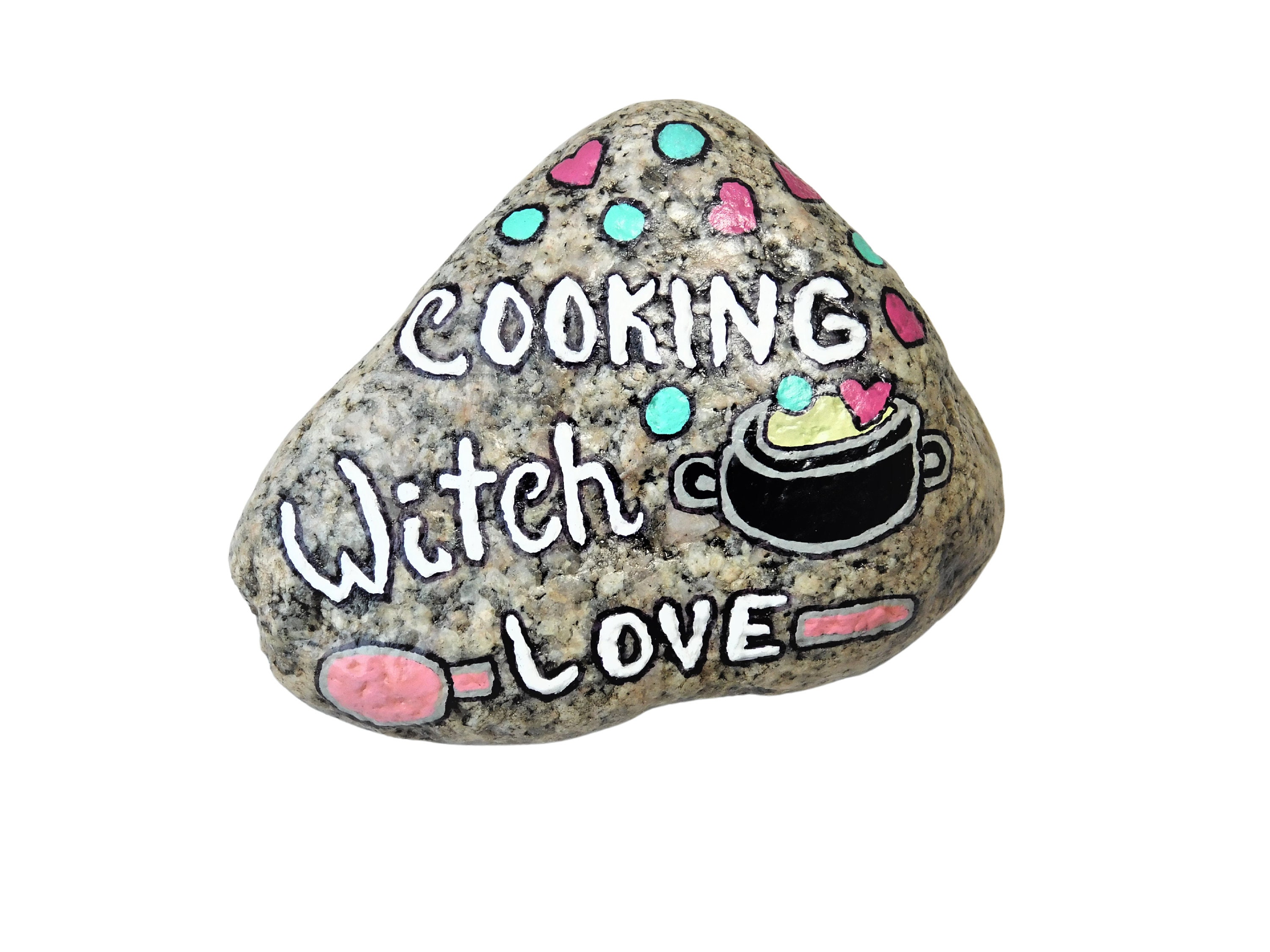 Here is an XXXLarge approximately- 2 7/8" X 3 1/2" X 2 1/4" beautiful witchy hand-painted "Cooking Witch Love" on a natural Pink Granite stone gathered by me in Nebraska. Sealed with gloss varnish to help preserve the art. You will receive One (1) Stone pictured in the photos.