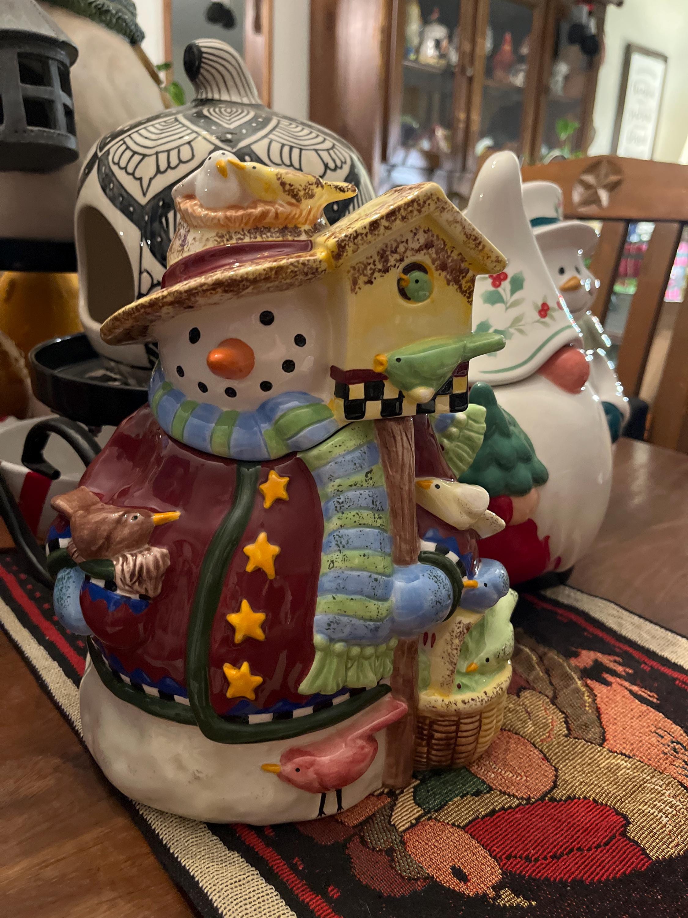 Vintage Gibson Debi Hron Frolic Snowman W/ Birds And Birdhouse Ceramic Cookie Jar- Pre-Owned