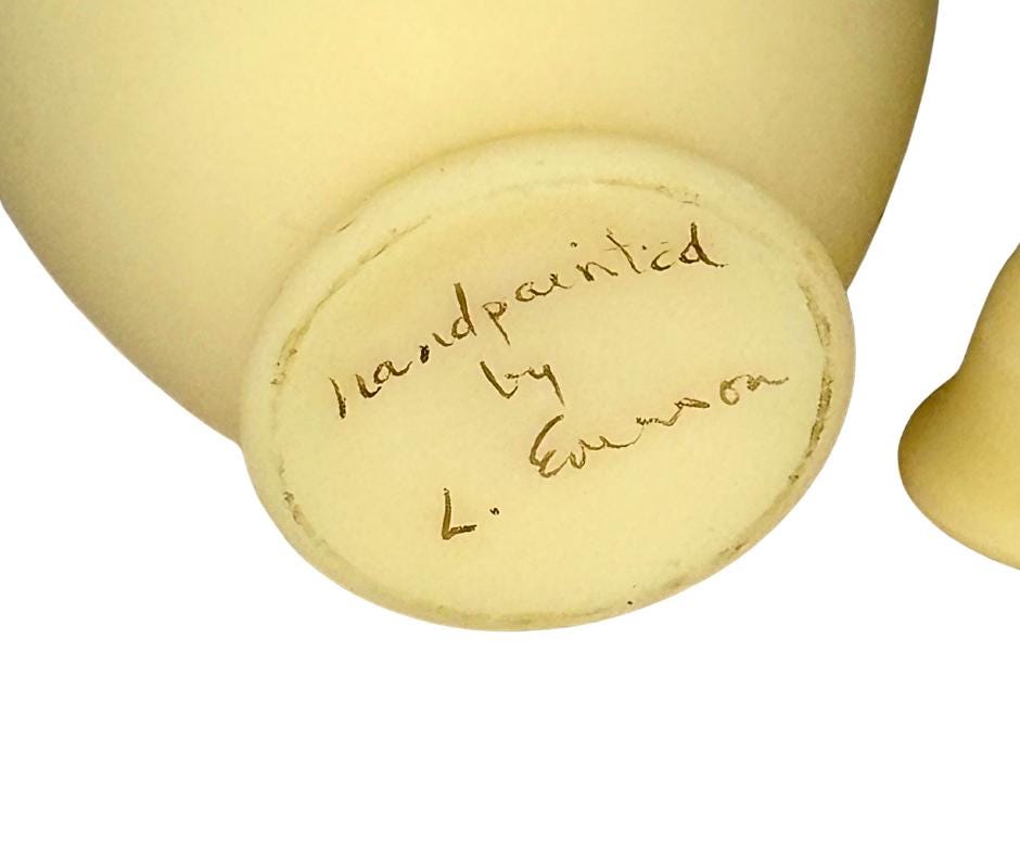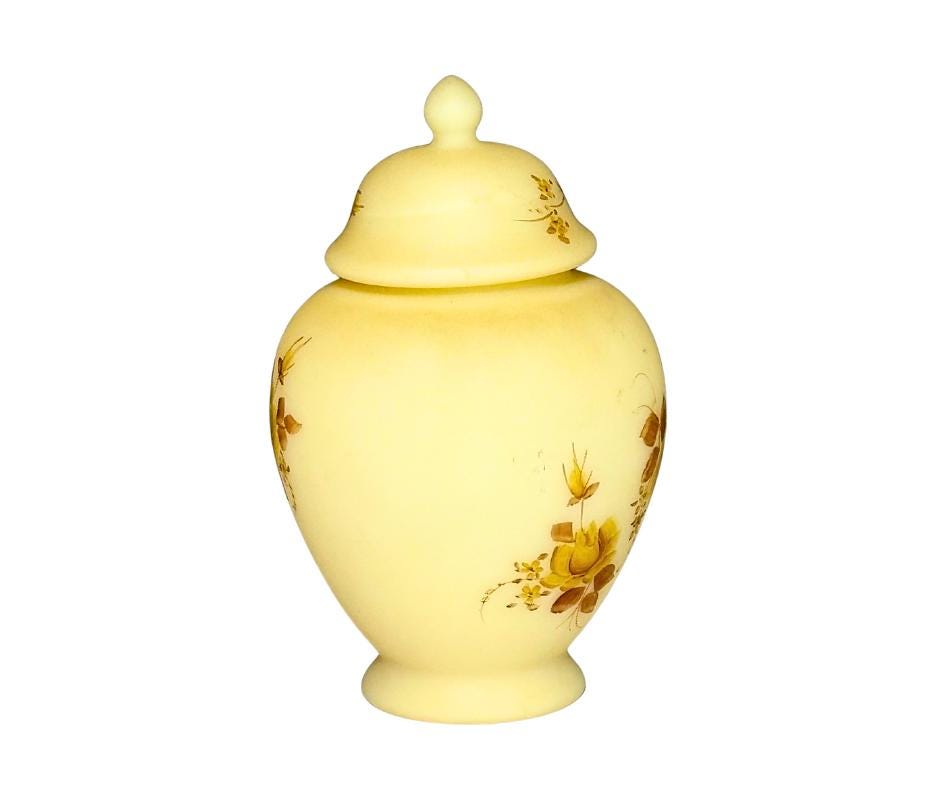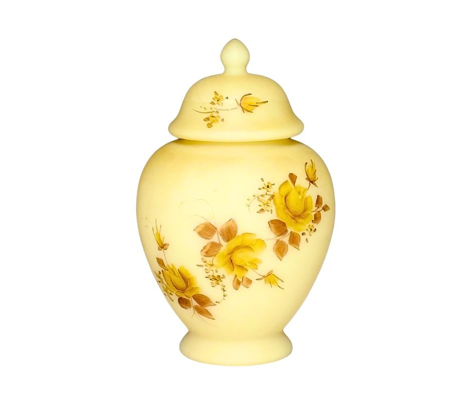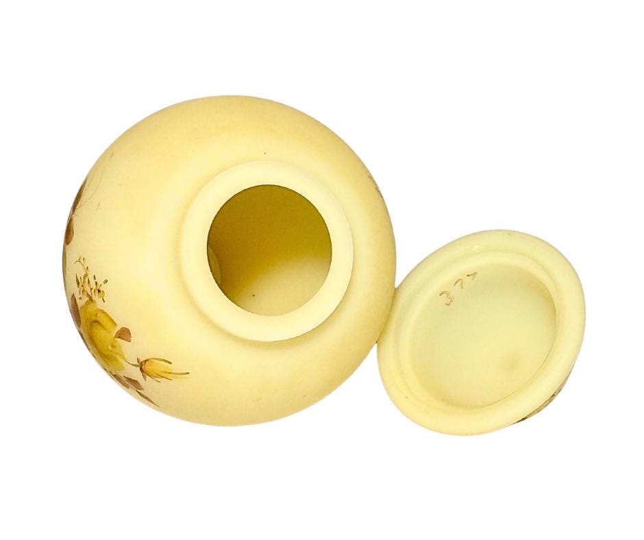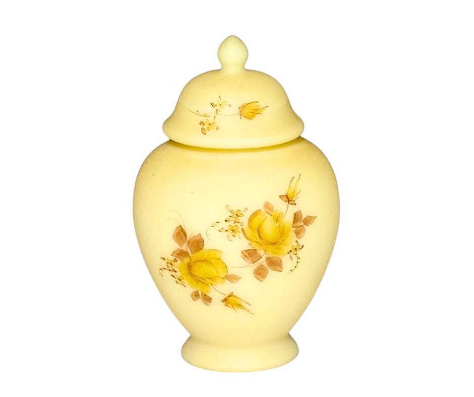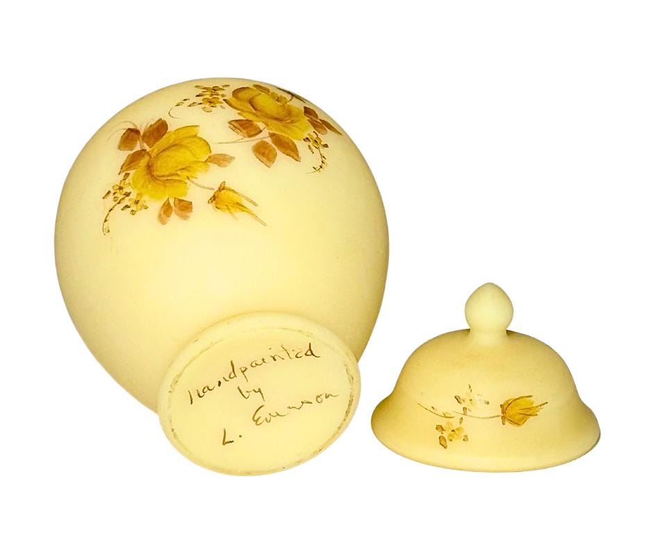 Vintage Hand Painted By L. Everson Fenton Art Glass Chocolate Roses On Cameo Satin Temple Jar With Lid- Pre-Owned