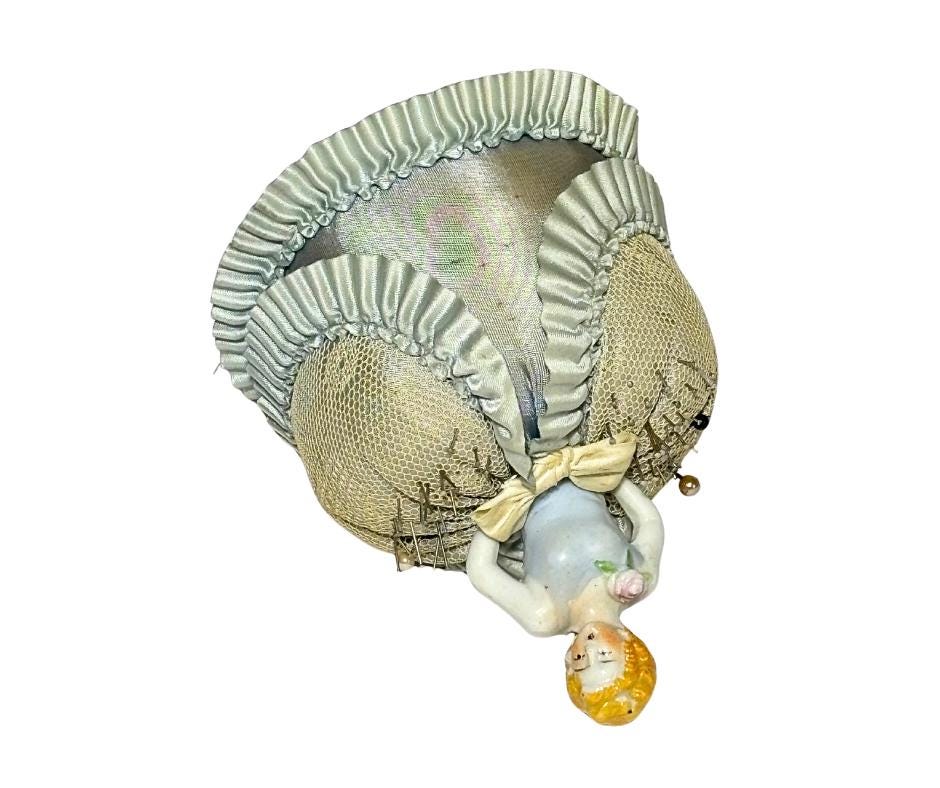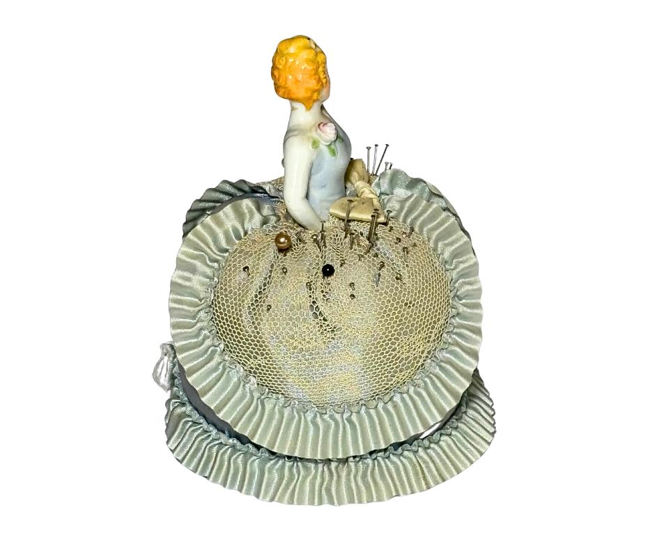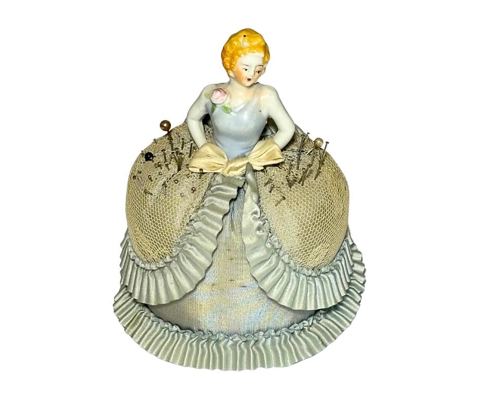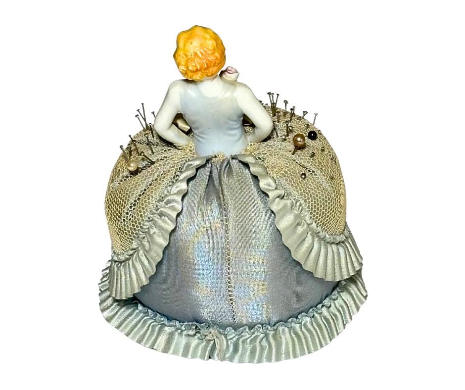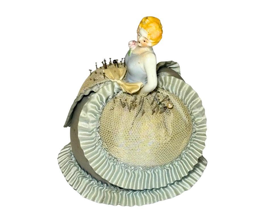 Antique 1920s Hand Painted Porcelain Half Doll Flapper Girl Style Pincushion Collectible Figurine With Pins