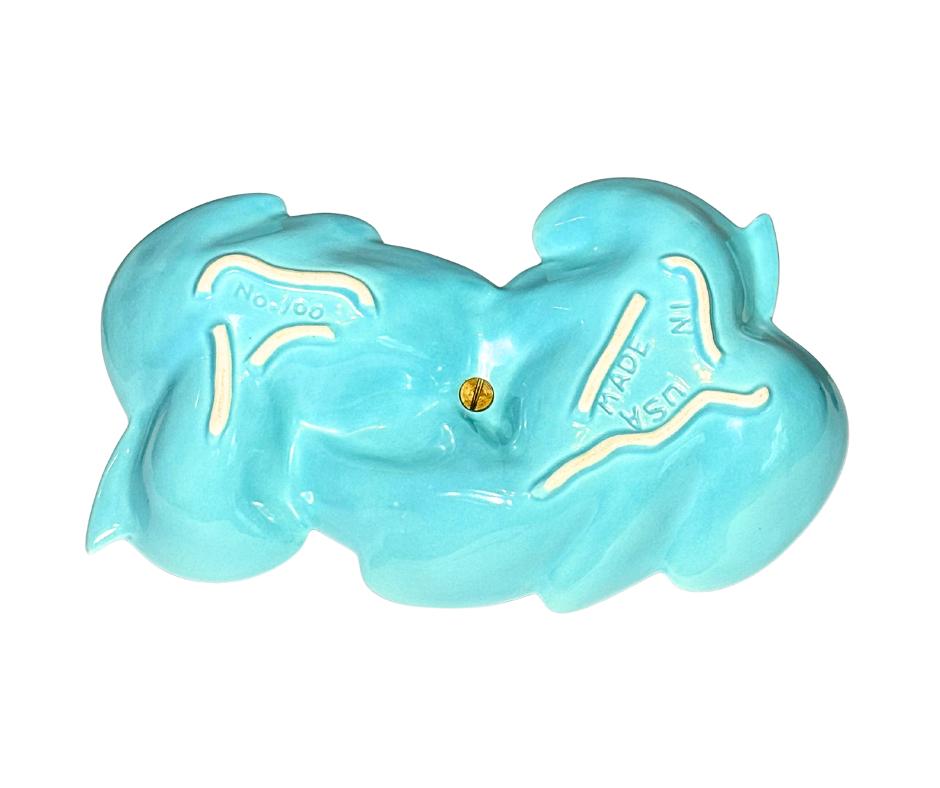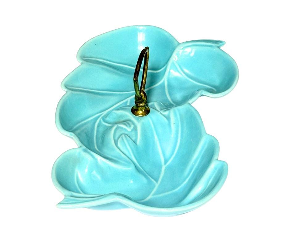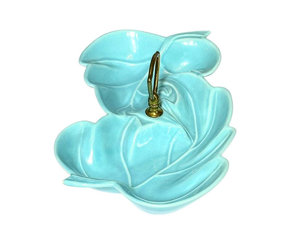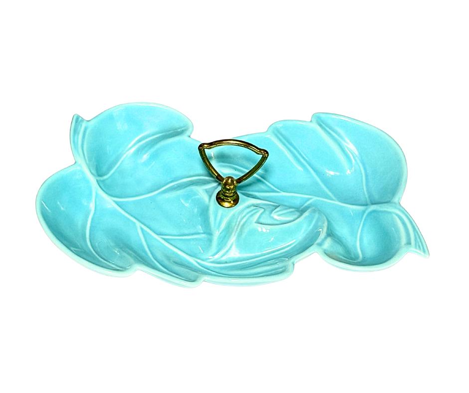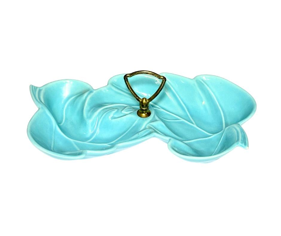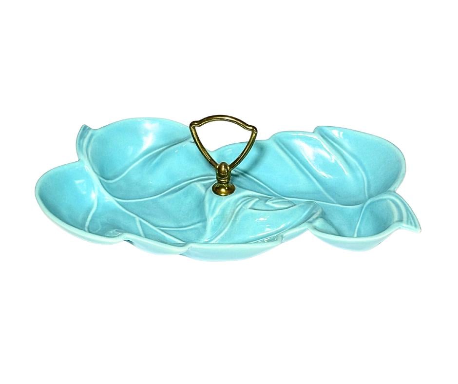 Vintage Sylvan's Of Pasadena California Pottery Aqua Blue Double Leaf Ceramic Candy Trinket Dish With Brass Handle- No. 100
