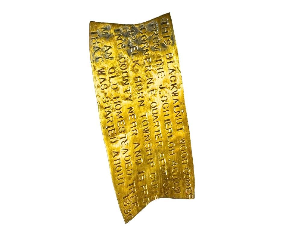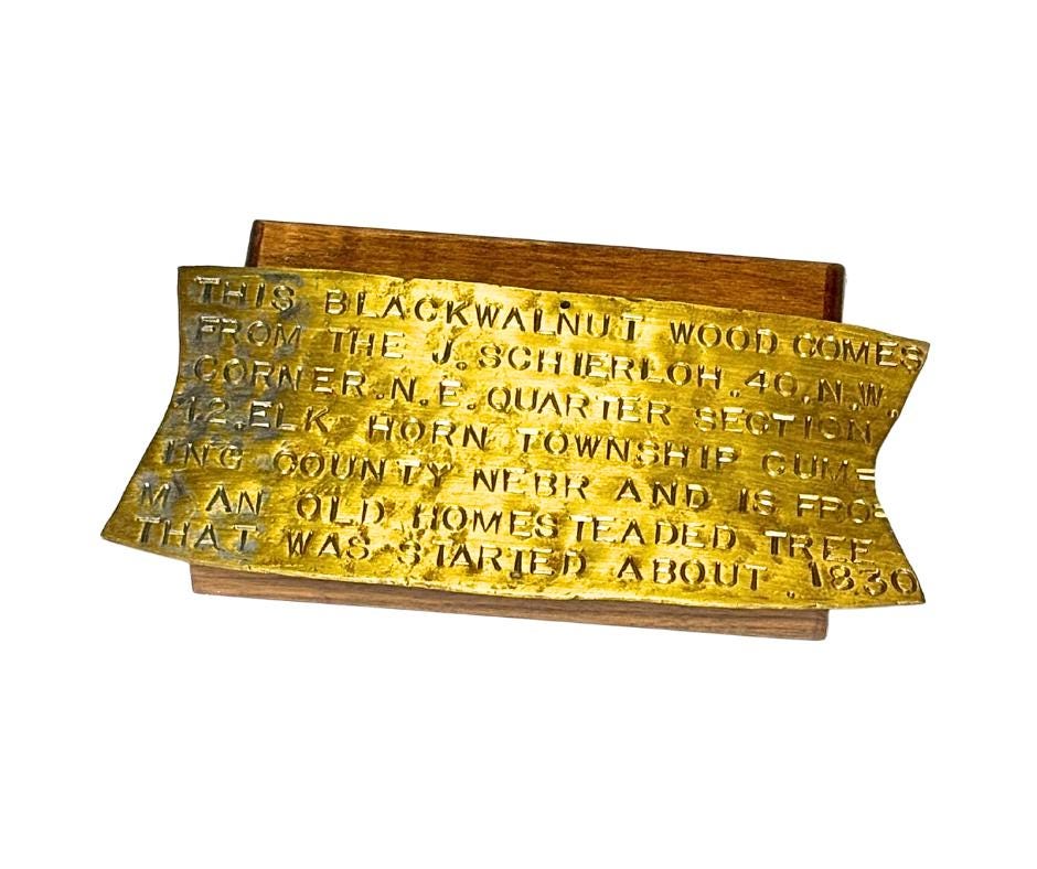 Antique Brass Plaque Commemorating Black Walnut Wood From A Homesteaded Tree Dating 1830 In Cuming County, Nebraska