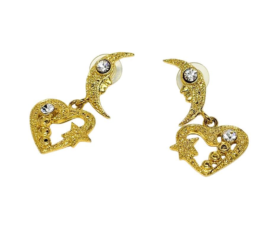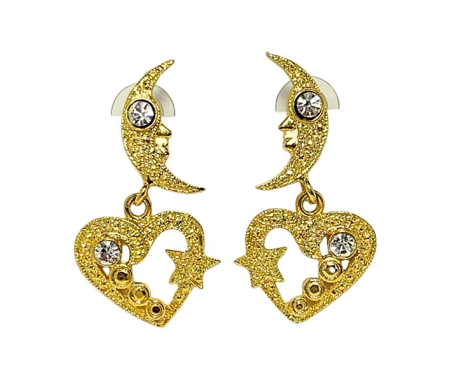 Vintage Gold Tone Moon Heart And Star Rhinestone Dangle Drop Pierced Earrings
