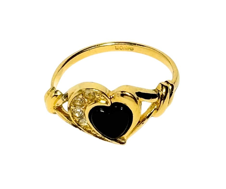 Vintage 1992 Avon Gold Tone Black Onyx And Clear Rhinestones Heart Size 9 Ring- Pre-Owned.