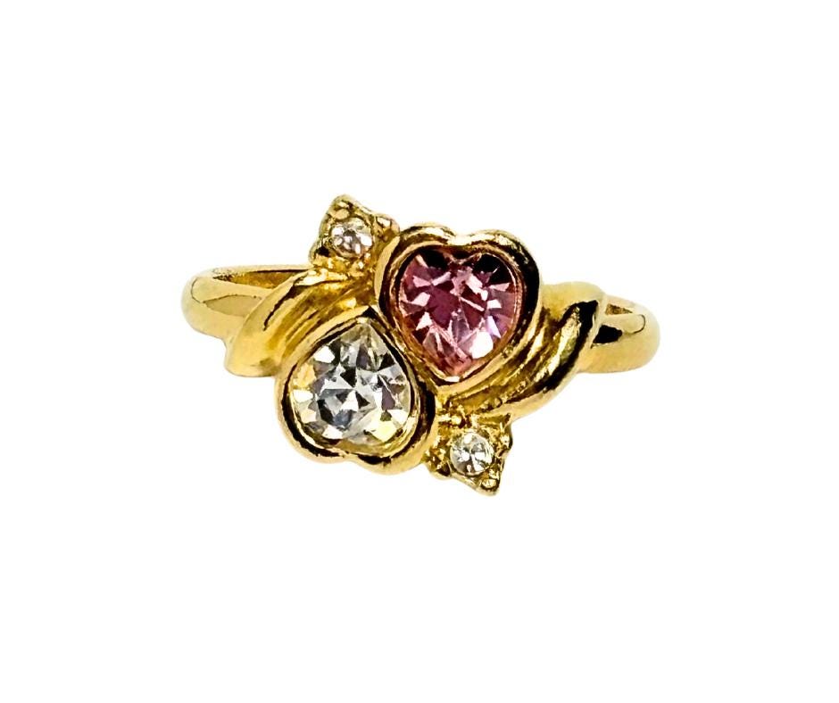Vintage 1990s Avon Gold Tone Pink And Clear Rhinestones Two Hearts Size 8 3/4 Ring- Pre-Owned.