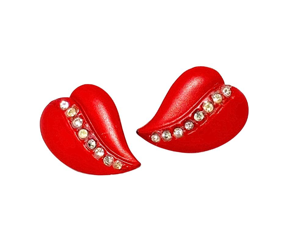 Vintage Red Painted Metal Heart And Rhinestones Pierced Earrings