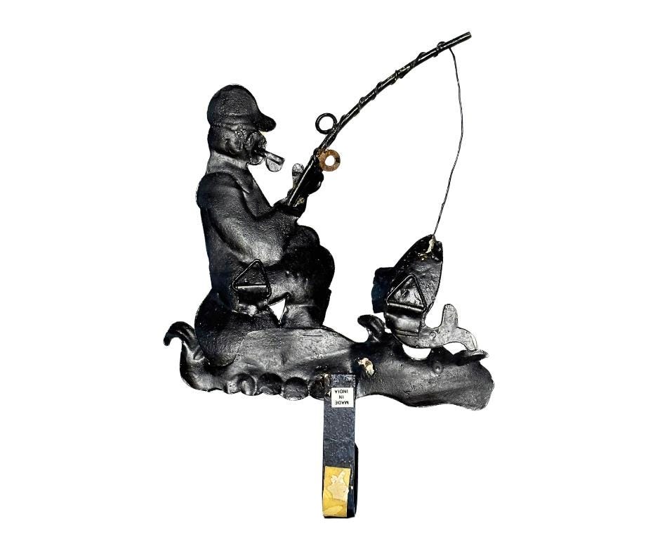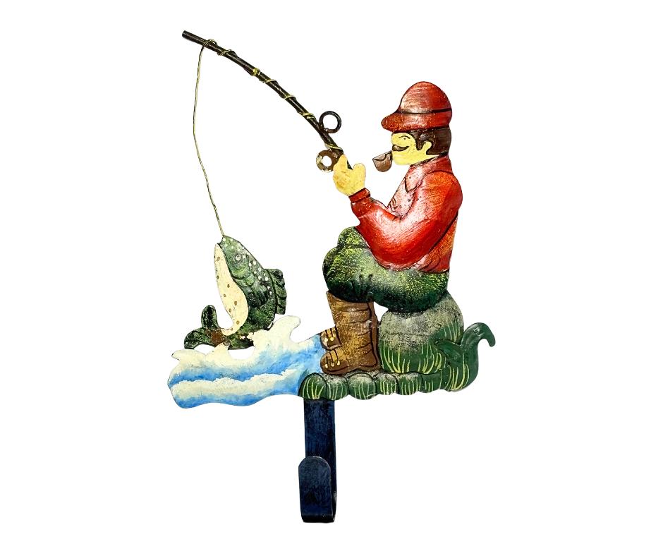 Vintage Hand-Painted Decorative Metal Fisherman Wall Hanging With Single Hook