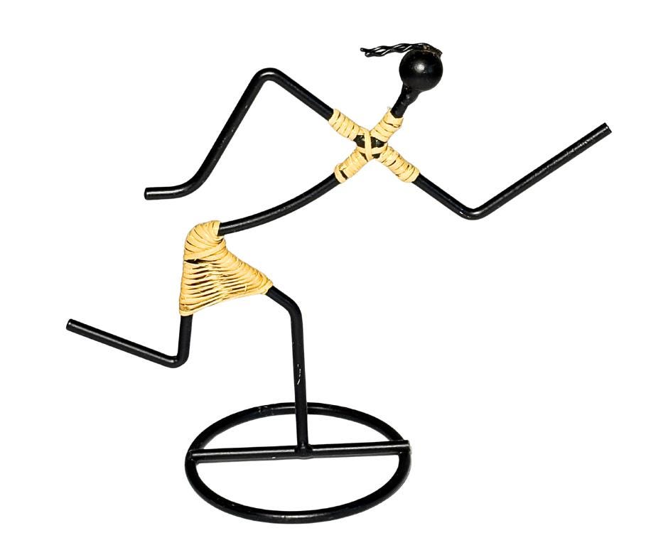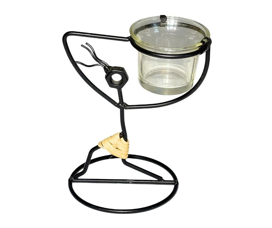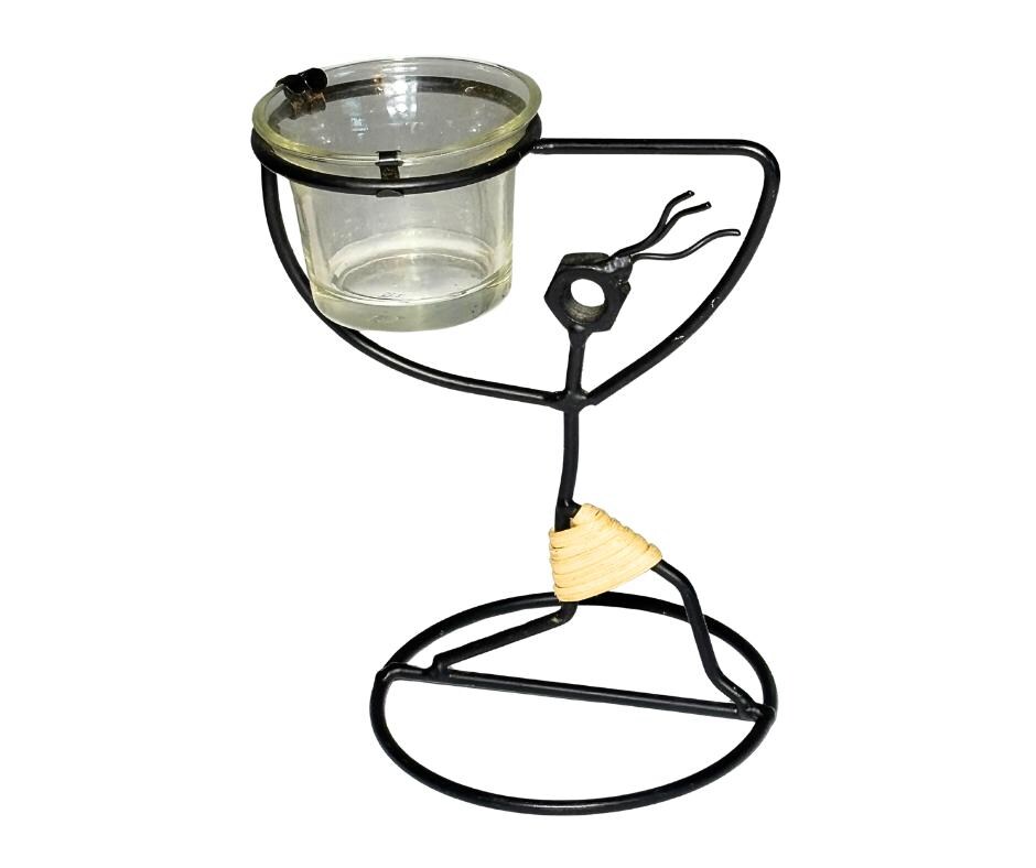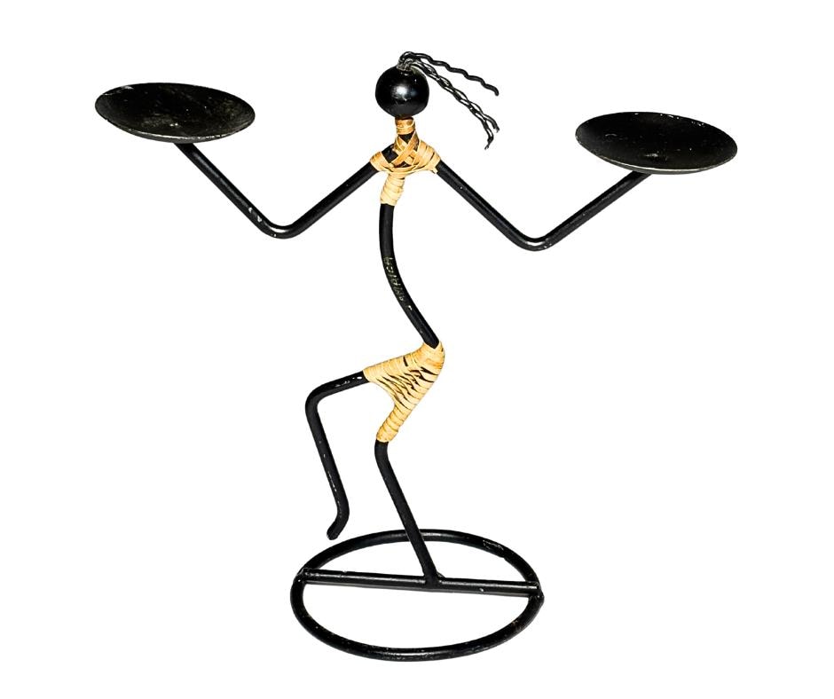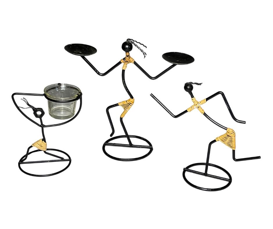 Vintage 1960s Laurids Lønborg And 1980s Safari Style Black Iron And Rattan Goddess Tribal Sculpture Candle Holders Set Of Three- Pre-Owned