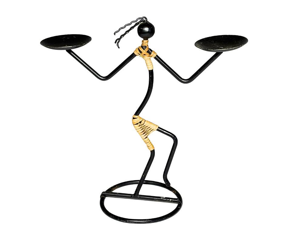 Vintage 1960s Laurids Lønborg And 1980s Safari Style Black Iron And Rattan Goddess Tribal Sculpture Candle Holders Set Of Three
