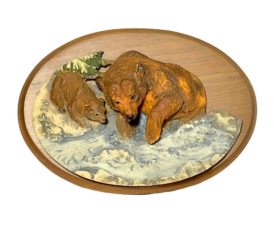 Vintage 1988 Avon American Wildlife Collection 3D Brown Bear And Cub Handcasted Wood Wall Plaque- Pre-Owned.