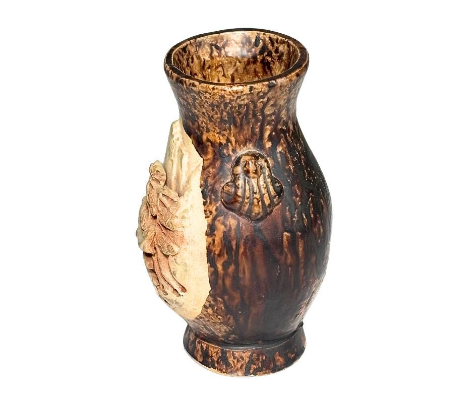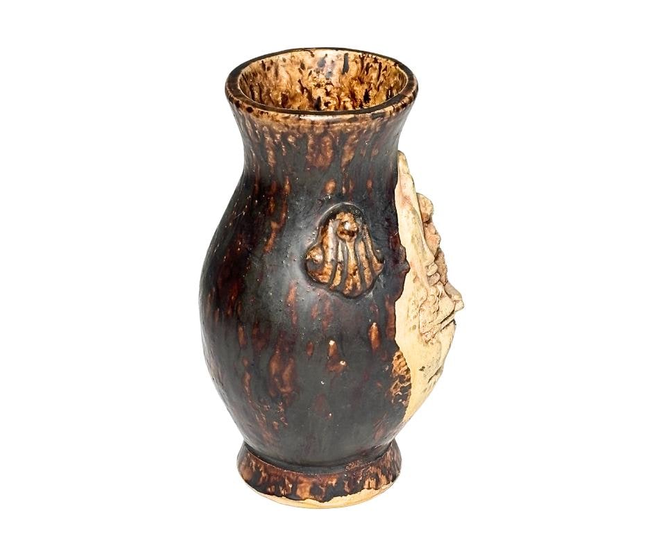 Vintage 1940s Japanese Banko Red Ware 3D Hand-Carved Relief Raku Pottery Vase With Paper