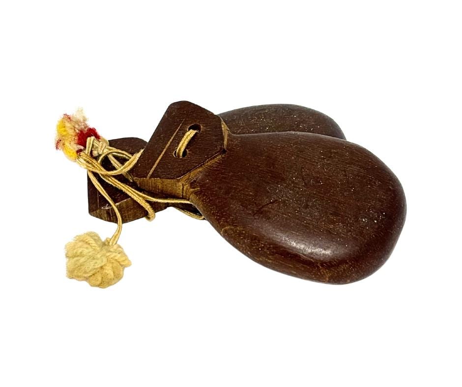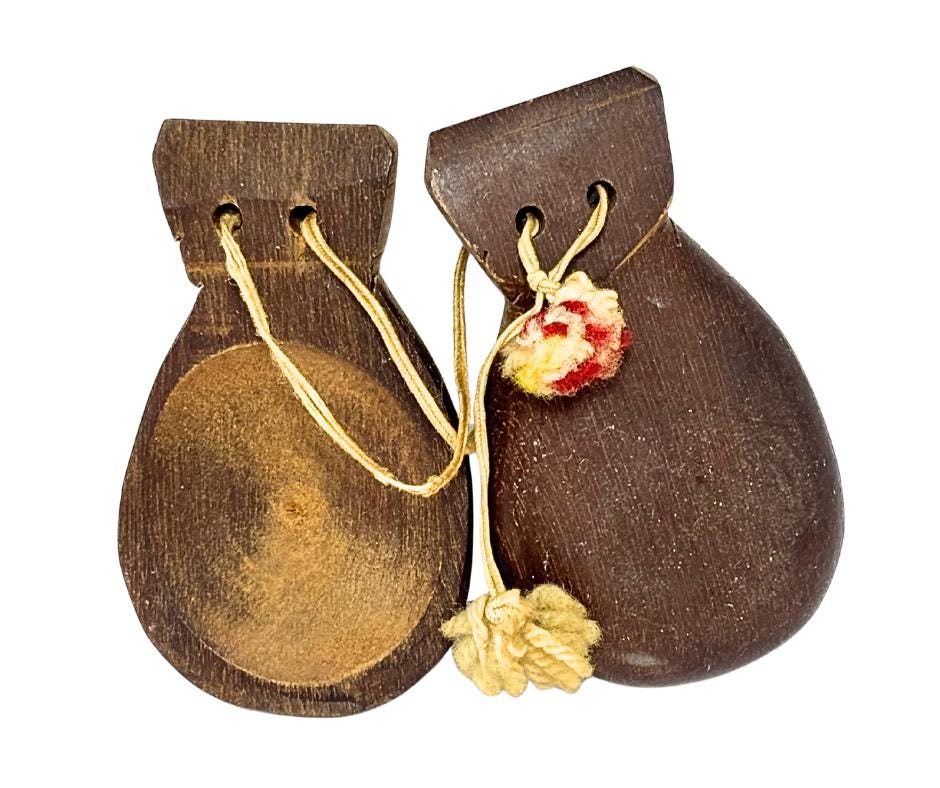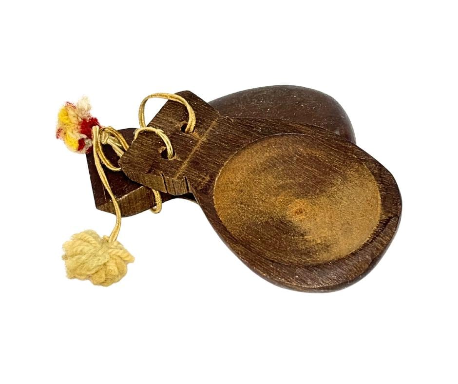 Vintage 1940s Hand-Carved Wooden Castanets Musical Percussion Spanish Folk Flamenco Instrument With Decorative Tassels