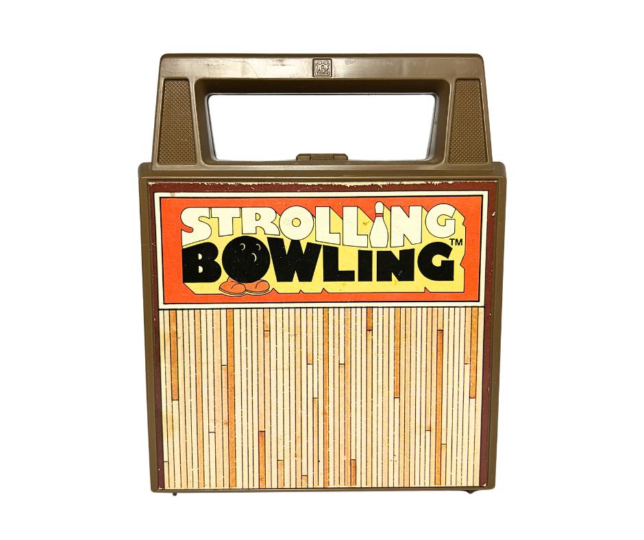 Vintage 1979 Tomy Strolling Bowling Portable Alley Wind-Up Toy With Black Ball Pins And Case Game